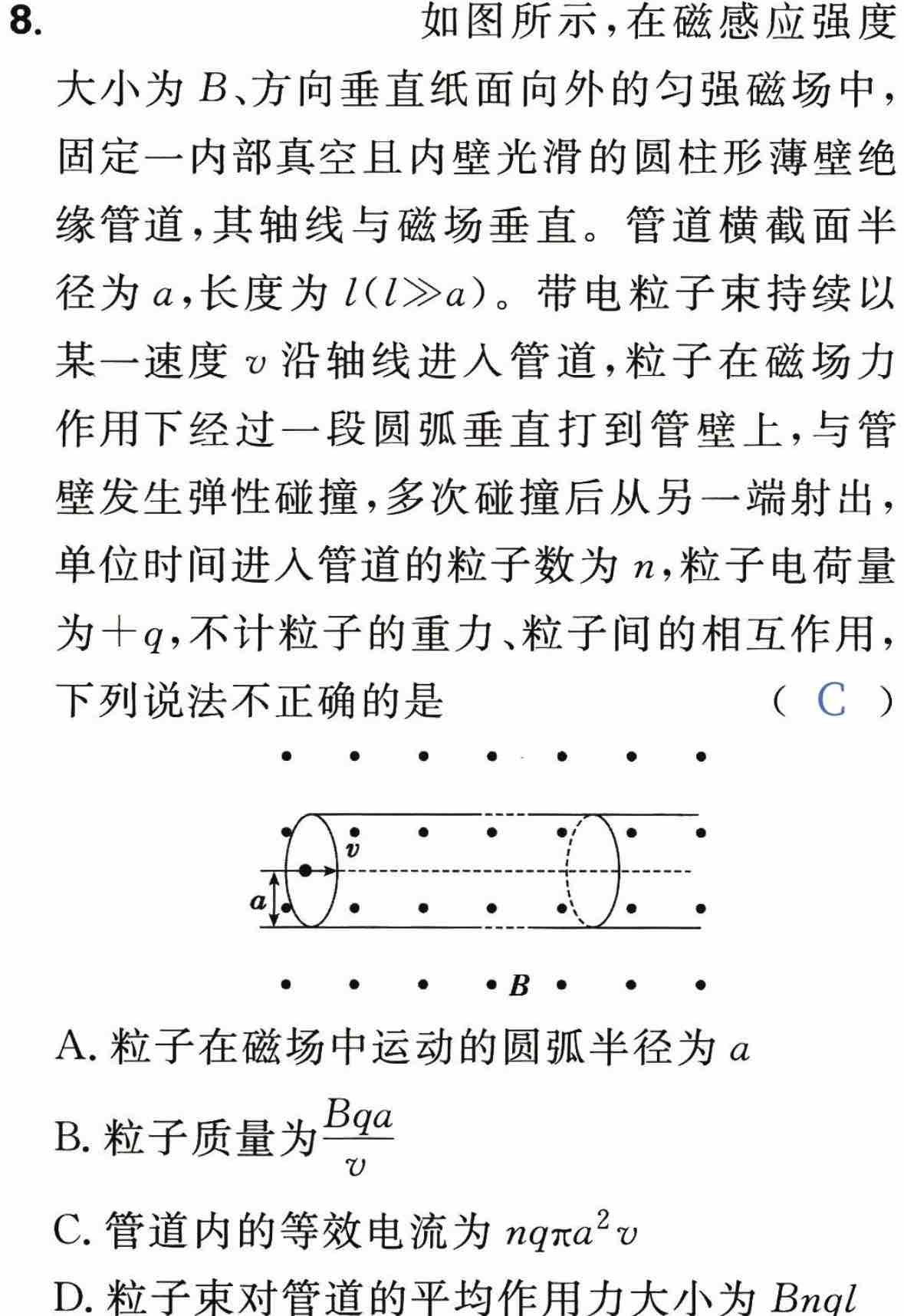 D选项,从微观定义 N=l/2a,每次动量变化2mv,t内nt个例子在第一个点碰撞,同时N个位置都在发生。以此求平均作用力。另外的方法,直接用安培力(等效过程还有点模糊)