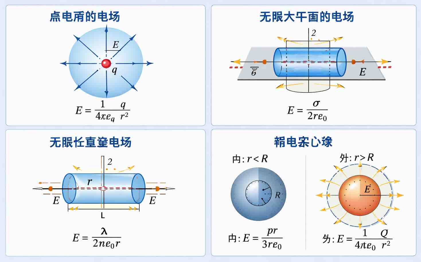 一、均匀带电球体、球壳、无限长带电导线和无限大带电平面的电场,利用对称性,选取高斯面,球面、圆柱面、药丸盒