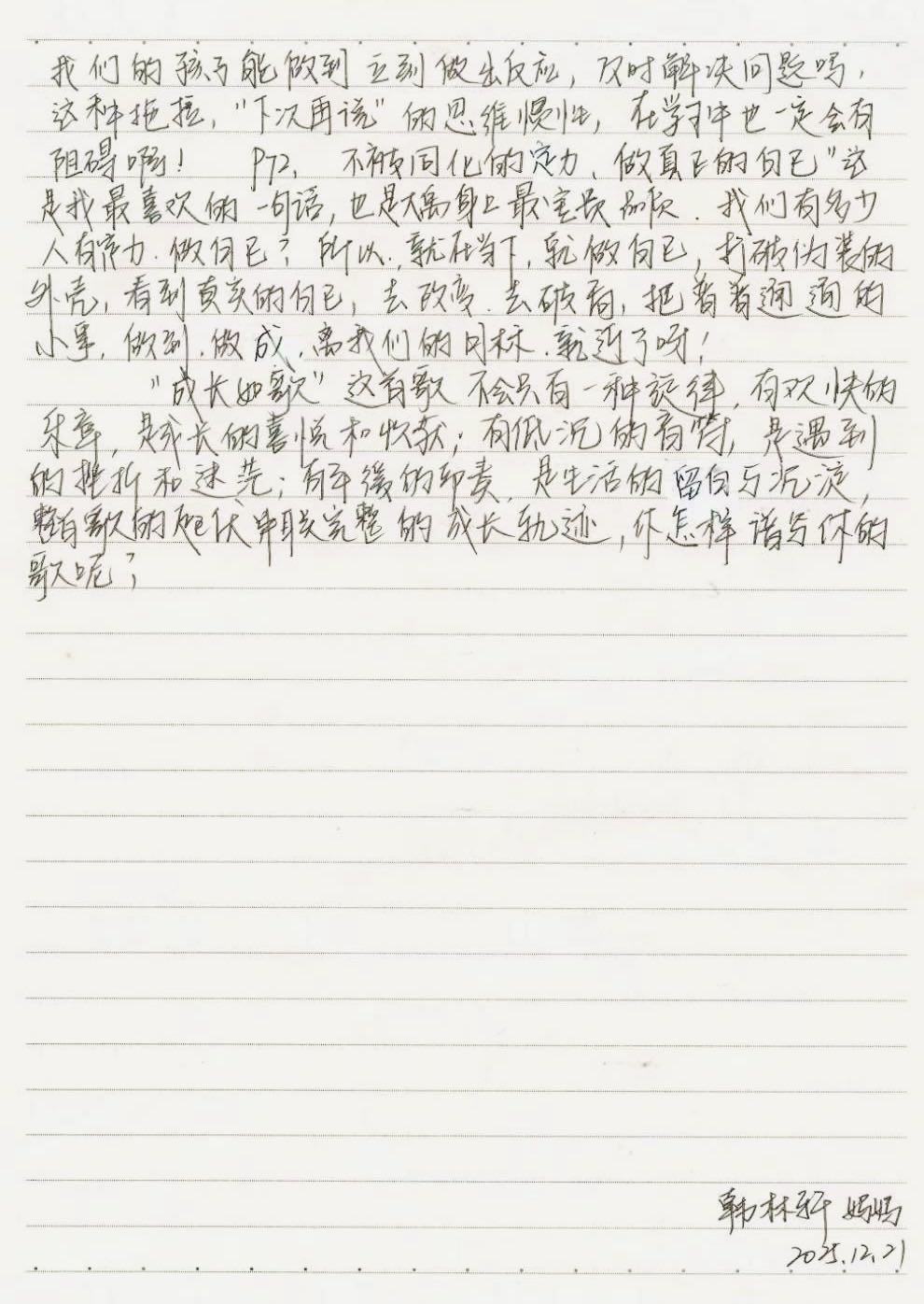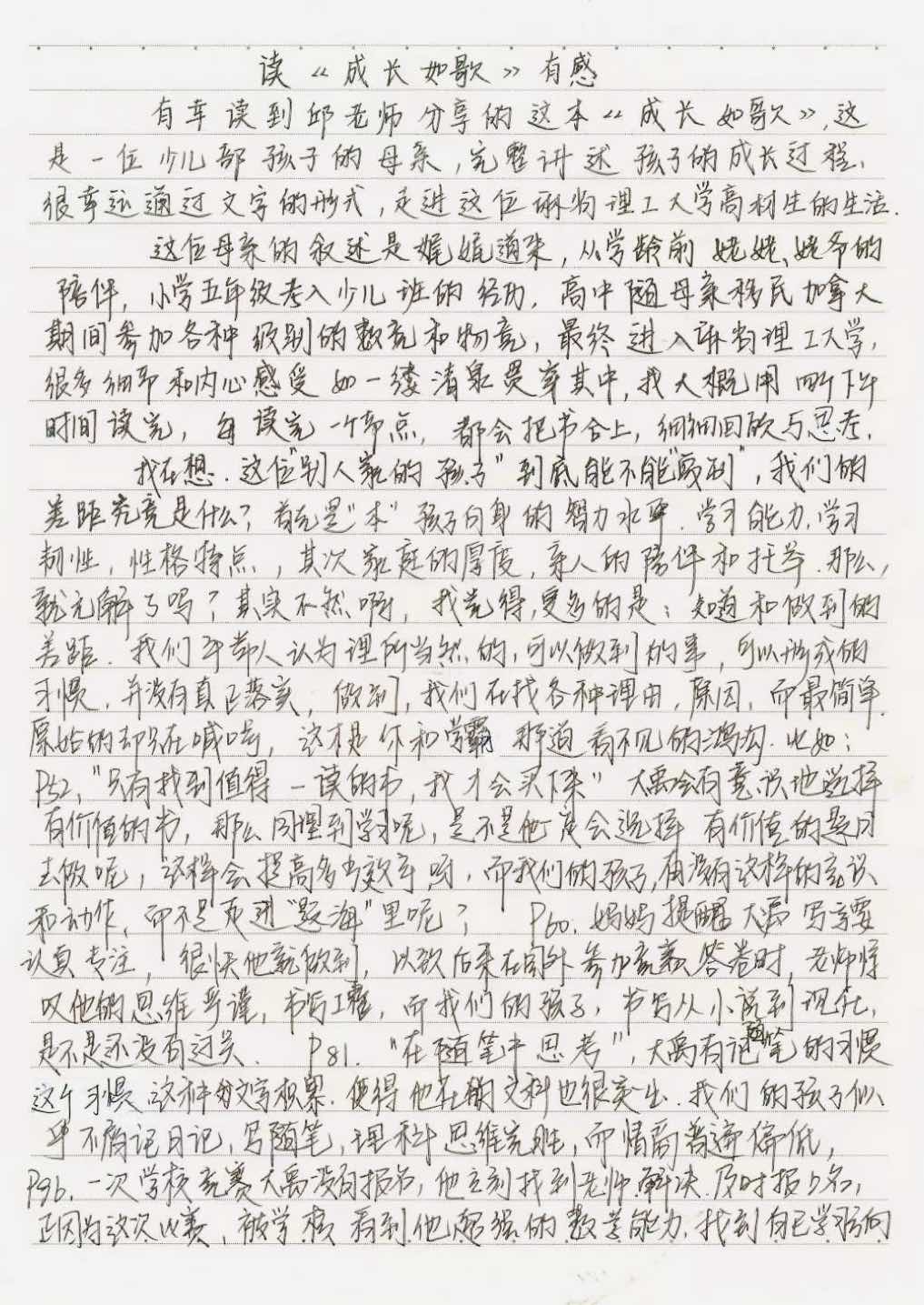开学以来,湛宇与您交流更多,感谢您对他额外的点拨教导,让他树立了信心,明确了方向。更感谢因您而拜读到《成长如歌》,认识了一位近乎完美的学霸和一位有才学有远见的妈妈。