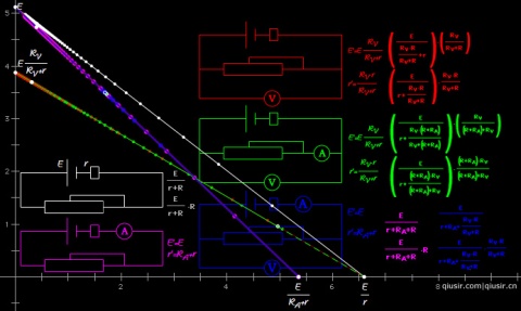 紫:用理想电压表(图中略)与现实电流表(电流表电阻不为零,且不可忽略)测量,与坐标轴U-I的截距分别E和E/(r+RA)。测量内阻r偏大,相当串联了电流表电阻,而电动势E不变。