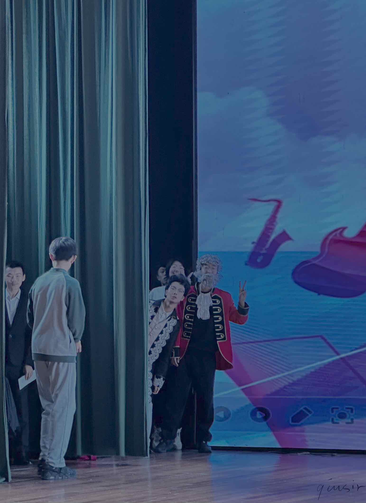 同学知道我不怎么参加集体活动,关于看话剧,这几天非正式提过几次,串场过程中课代表小鹿童鞋穿着戏服跑回来邀请,再不去说不过去啊,特地让肖老师陪我去。手机比较旧,早早没电了,还好,两个班都拍到了。